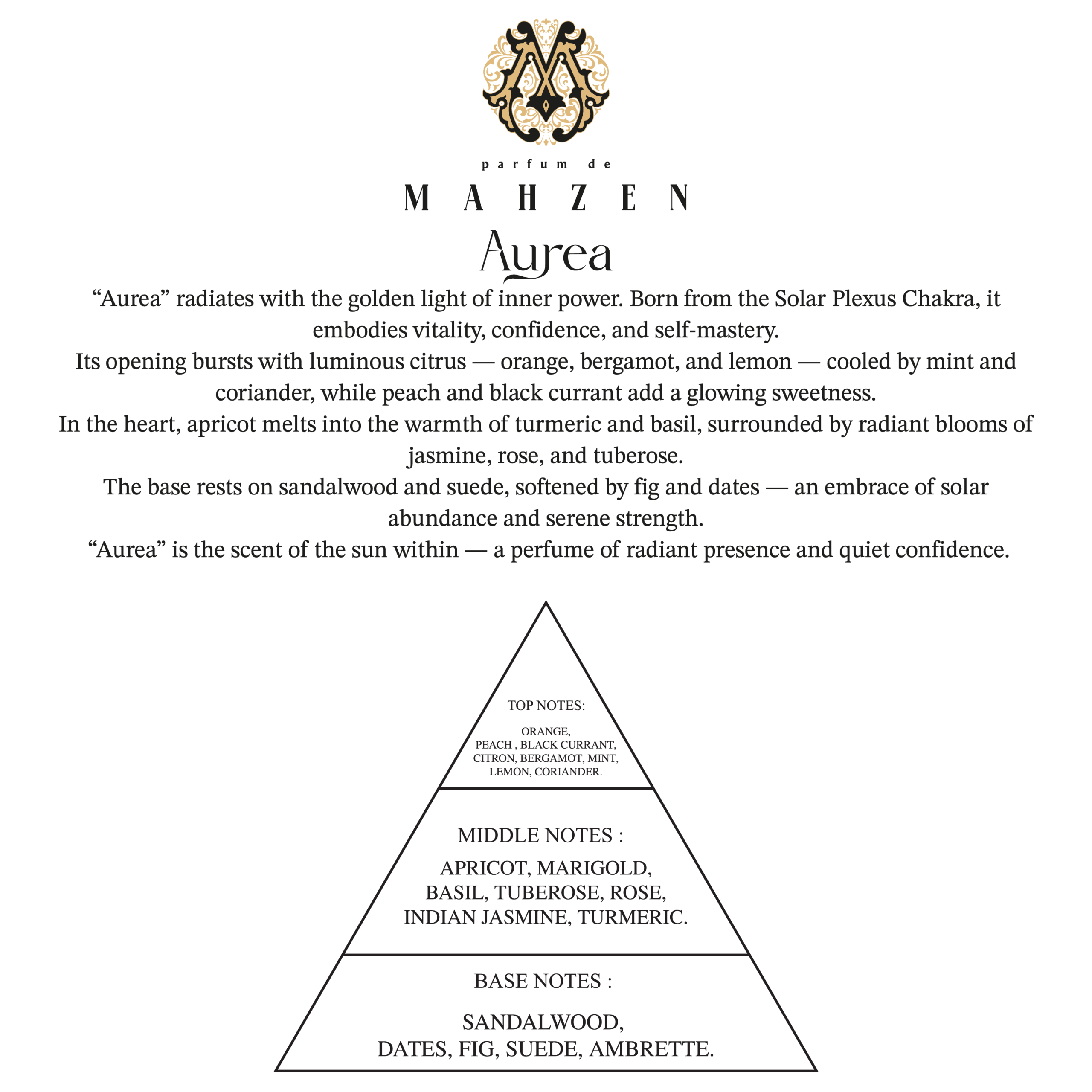 “Aurea” radiates with the golden light of inner power. Born from the Solar Plexus Chakra, it embodies vitality, confidence, and self-mastery. Its opening bursts with luminous citrus notes of orange, bergamot, and lemon, cooled by mint and coriander, while peach and black currant add a glowing sweetness. In the heart, apricot melts into the warmth of turmeric and basil, surrounded by radiant blooms of jasmine, rose, and tuberose. The base rests on sandalwood and suede, softened by fig and dates—an embrace of solar abundance and serene strength. “Aurea” is the scent of the sun within—a perfume of radiant presence and quiet confidence.